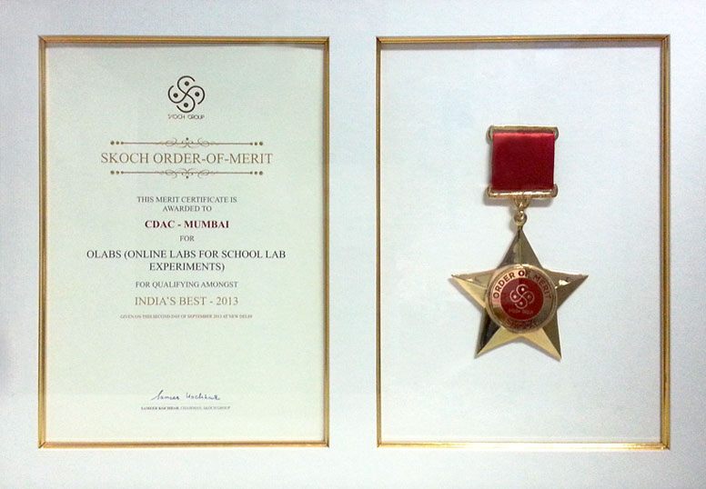 These medals along with certificates were conferred to CDAC Mumbai in an awards ceremony held at 33rd SKOCH Summit during September 2-3, 2013 in New Delhi. SKOCH awards from SKOCH Group are hailed as one of the highest independently instituted civilian honours in the country and considered as independent benchmarks for best practices in India in the fields of governance, finance, banking, technology, corporate citizenship, economics and inclusive growth.