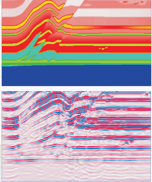 SeisKDM: 2D velocity model of salt extracted from 3D SEG/EAGE Salt data and corresponding SeisKDM outcome.