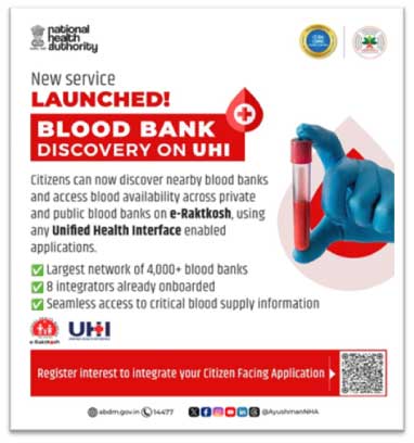 NHA has recently launched the blood bank discovery feature on the UHI. This allows patients to discover blood banks and check stock availability using C-DAC�s e-RaktKosh repository of 4000+ blood banks.