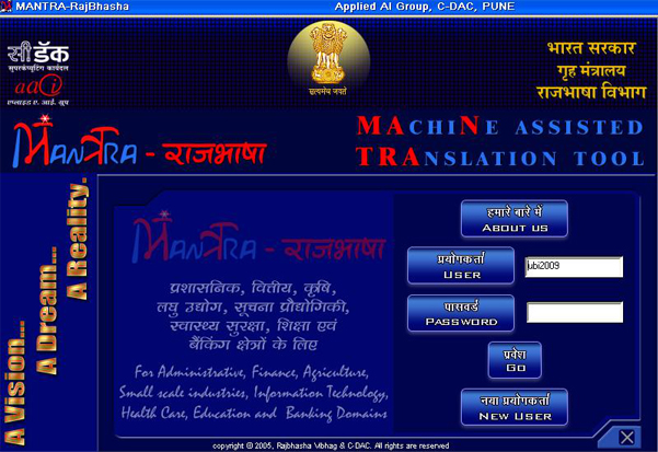 MANTRA-Rajbhasha is a MAchiNe Assisted TRAnslation Tool to facilitate the translation of documents pertaining to Personnel Administration, Finance, Agriculture, Small Scale Industries, Information Technology, Healthcare Education and Banking domains from English to Hindi. The system is based on the MANTRA Technology developed by the Applied Artificial Intelligence Group (AAI) of C-DAC, Pune. Sponsored by the Department of Official Language (DOL), Ministry of Home Affairs, Government of India, Mantra-Rajbhasha has been developed as Standalone, Intranet and Internet versions. MANTRA-Rajbhasha has been designed to assist the various departments and ministries of the government to procure quick and standard Hindi translations of English documents.