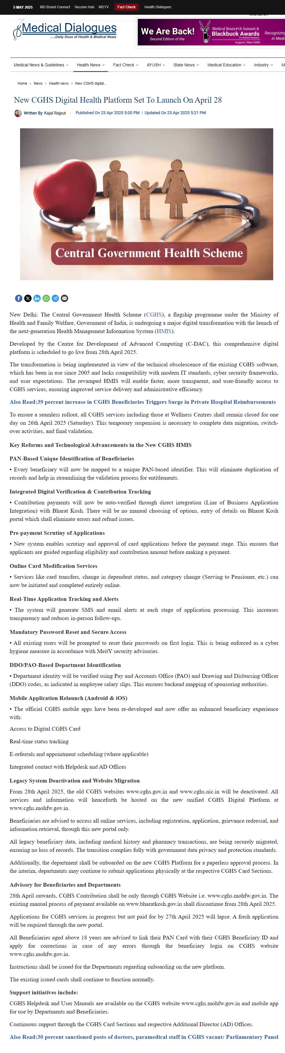 Source URL:https://medicaldialogues.in/news/health/new-cghs-digital-health-platform-set-to-launch-on-april-28-147181