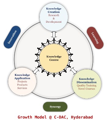 C-DAC, Hyderabad is a Knowledge centre with the components of Knowledge Creation, Knowledge Dissemination, Knowledge Application to grow in the areas of Research & Development, Training and Business respectively. The R & D areas of the centre are e-Security, Embedded Systems, Ubiquitous Computing, e-Learning and ICT for Development