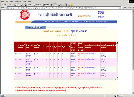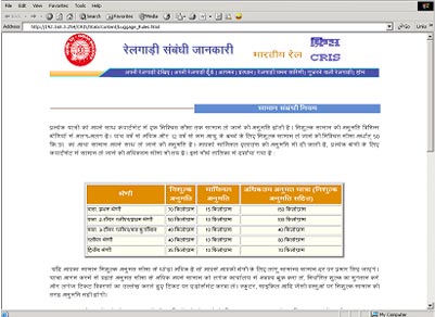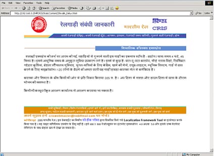 Trains Enquiry Web site (in English) contains static and dynamic data in the form of information about trains and their schedules. This information is taken from a backend database and displayed through web pages. For localization of the web site, the English content of the web site is converted to Hindi. The localization of the web application involves translation of static content, generation of local language data from English data used at the backend, generation of localized UI elements used in the web application. In addition to display of information, user interactions in the form of queries and search facility have been provided in Hindi.