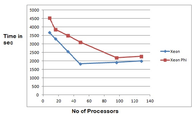 Gromacs is a molecular dynamics code used for simulation of biochemical molecules like proteins, lipids and nucleic acids that have a lot of complicated bonded interactions. It simulates the Newtonian equations of motion for systems with hundreds to millions of particles. This code is an open source code primarily written in C and parallelized using hybrid OpenMP and MPI models, with the compute intensive parts written in Intel intrinsic instructions. Speedup of AcoMod on Sandybridge with different optimizing techniques Execution of AcoMod in native execution mode on single Xeon Phi card As Intel intrinsic instructions are architecture specific, the performance drop in the code was observed while running the code on Xeon Phi platform (PARAM Yuva II). A version of Gromacs in which the hotspot was coded using 512 bit Intel intrinsic instructions for Xeon Phi was obtained and integrated into existing version of Gromacs. The code was then entirely recompiled as the input data generation steps contained Gromacs tools, which are version specific. Benchmarking of the compiled version of code was done both for host and Xeon Phi in native execution mode using Gromacs standard benchmarking input.