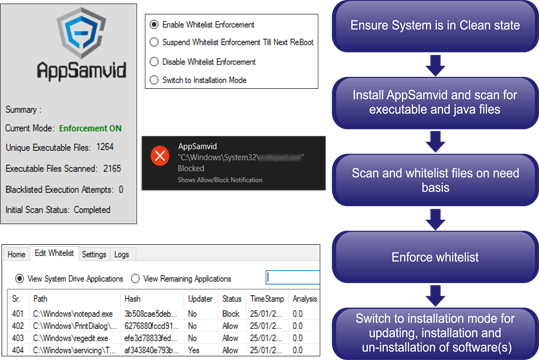 AppSamvid is an application whitelisting software for Microsoft Windows based operating systems. Whitelisting allows only pre-approved files to execute on operating system. This is in contrast to traditional signature based antivirus software approach of blacklisting the virus files. Whitelisting has the advantage over blacklisting as it does not require frequent virus definition updates. AppSamvid can protect operating system against computer malware (such as Viruses and Trojans).