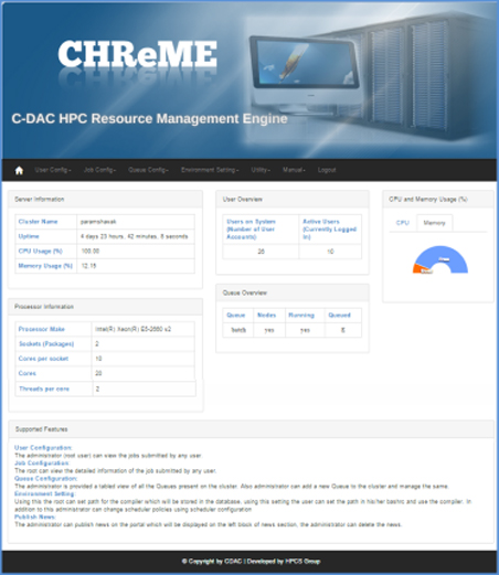 The growth of Parallel Applications in Scientific and Engineering domain has posed a serious challenge of efficient and easy usage and management of resources of HPC systems. To address this challenge, C-DAC has indigenously developed CHReME, which is a web-based Portal that empowers Scientists, Researchers, System administrators and HPC Users with intuitive GUI to exploit the various resources of HPC systems.