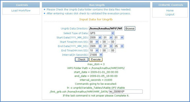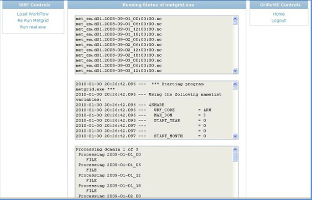 CHReME WRF Portal is an integrated solution with WRF application execution interface. WRF graphical user interface (GUI) guides users through the entire cycle of execution of WRF viz. WPS (WRF Pre-Processing), completion and post processing. The portal is as well as expert system users in the scientific domains. The GUI facilitates the user with a modular approach for WRF execution by creating various workflows, storing the workflow execution stages, setting up of environment variables, submission of the WRF execution jobs and monitoring the status of the workflows and visualization of the output.