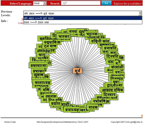 Say you have a word in your mind like सुर्य. This tool helps you to find the related word, synonyms. Its attractive representation will keep you engaged merely to explore and see the length of help it provides, so learning comes naturally and painlessly too.