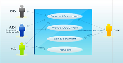 MANTRA-Rajya Sabha system simulates the Work-Flow adopted by the Translation Section of Rajya Sabha Secretariat. This system works on a LAN based Intranet environment and supports Document Management along-with the Translation engine. The system also has provision for a hierarchy based user structure as adopted by Translation Section which consists of designation such as Director, Deputy Director, Joint Director, Assistant Director, Editor, Translator and Typist. Each user is given a login-id and password created by the Admin through the system. The creation of login for users is based on the designation of each user which decides the right that a particular user will have inside the system.