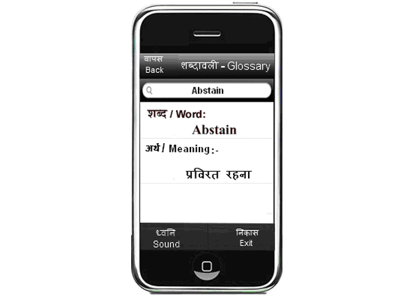 Applied AI group, C-DAC is also working on the mobile based glossaries on WAP as well as standalone applications. Some prototype applications have been developed. The facilities like bidirectional search Hindi-English, pronunciation of the words/phrases and Hindi typing are implemented. Using these glossaries user can fetch the meaning of the respective language on mobile screen and can hear the pronunciation of word at the same time.