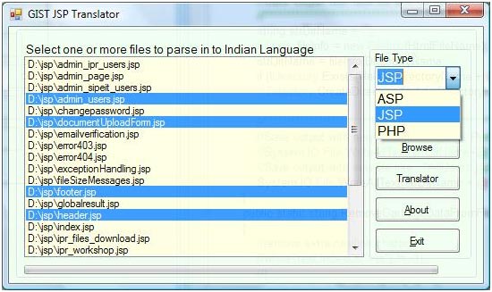 GIST JSP Translator Tool has been developed for easy and bulk conversion of JSP English data content into Indian languages. Currently it supports 11 Indian languages - Hindi, Marathi, Gujarati, Bengali, Assamese, Tamil, Telugu, Malayalam, Kannada, Punjabi, and Oriya. This application can browse multiple files of JSP, ASP or PHP from the list and translate them on one go. All tag will be parsed except non ASP, JSP, PHP, HTML tags. Fonts need to be applying in the CSS file so that data could be display in proper format.