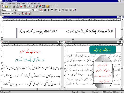 Unique to Nashir is its support for Nastaliq script with an array of beautiful calligraphic fonts. Various Naskh fonts including stylish fonts have been provided to enhance the aesthetics of text content. And a number of thoughtful tools and short cuts make it easy to use these fonts and apply styles, attributes.