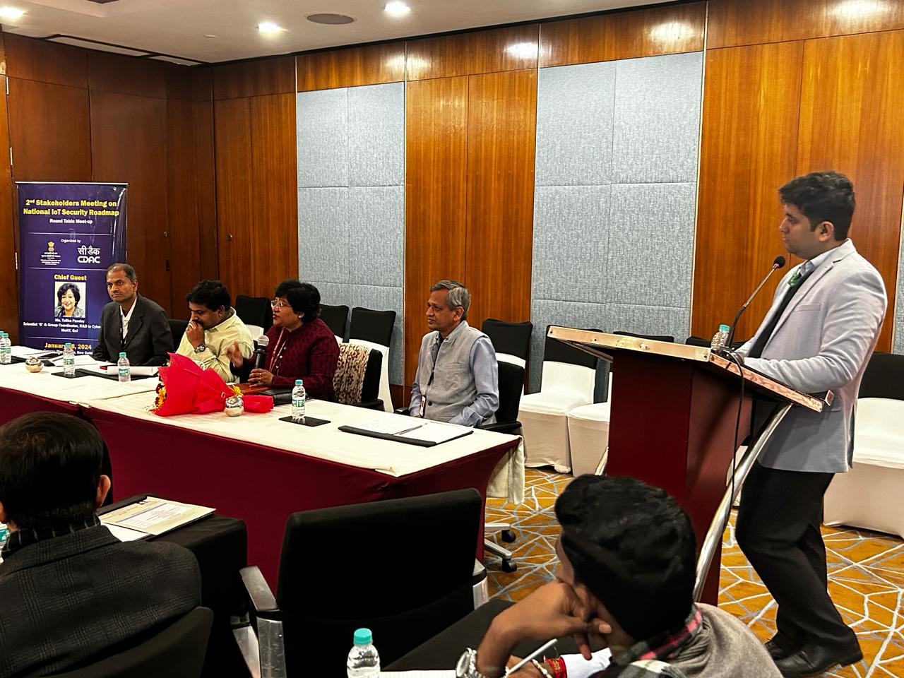 This is a round table event where stakeholders had fruitful discussions regarding various technologies, issues, and solutions for IoT device, network, and application-level security. The Distinguished Guests are Ms. Tulika Pandey, Group Coordinator, Cybersecurity R&D & Scientist G, Dr. S. D. Sudarsan, Executive Director, C-DAC, Bangalore, Mr. Hari Babu Pasupuleti, Associate Director, C-DAC Bangalore, Dr. Balaji R, Associate Director, C-DAC Bangalore, and Dr. Mohammad Misbahuddin, Associate Director, C-DAC Bangalore.