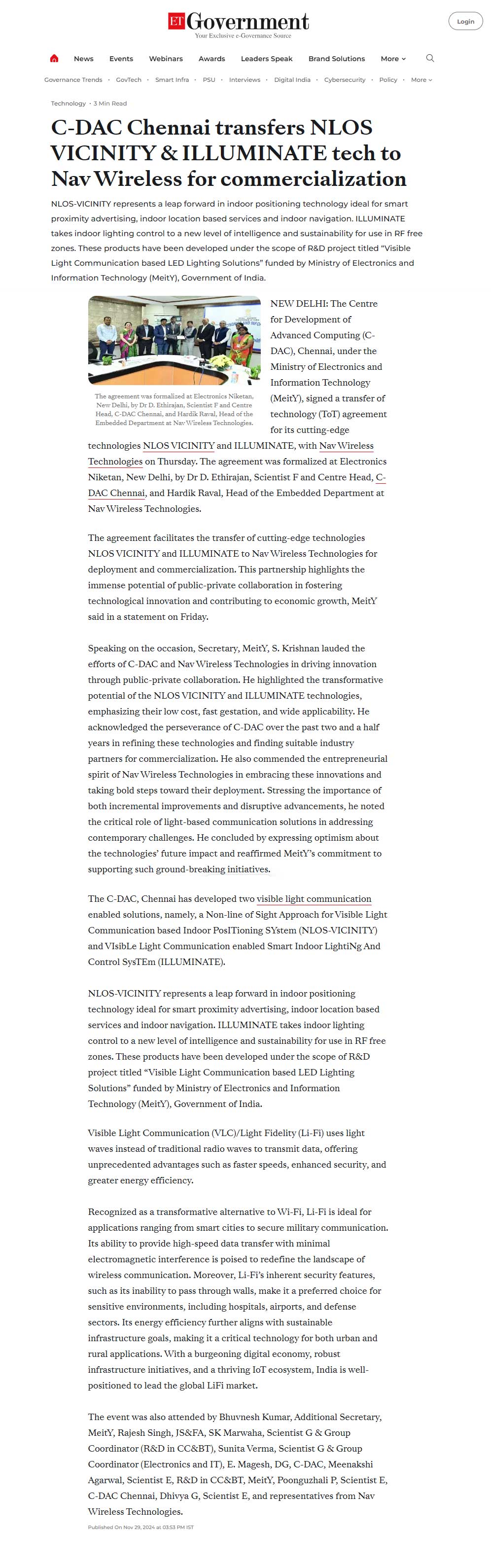C-DAC Chennai transfers NLOS VICINITY & ILLUMINATE tech to Nav Wireless for commercialization