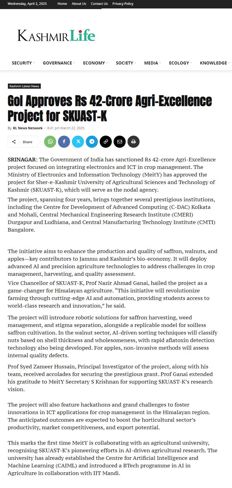 Source URL:https://kashmirlife.net/goi-approves-rs-42-crore-agri-excellence-project-for-skuast-k-386347/#google_vignette