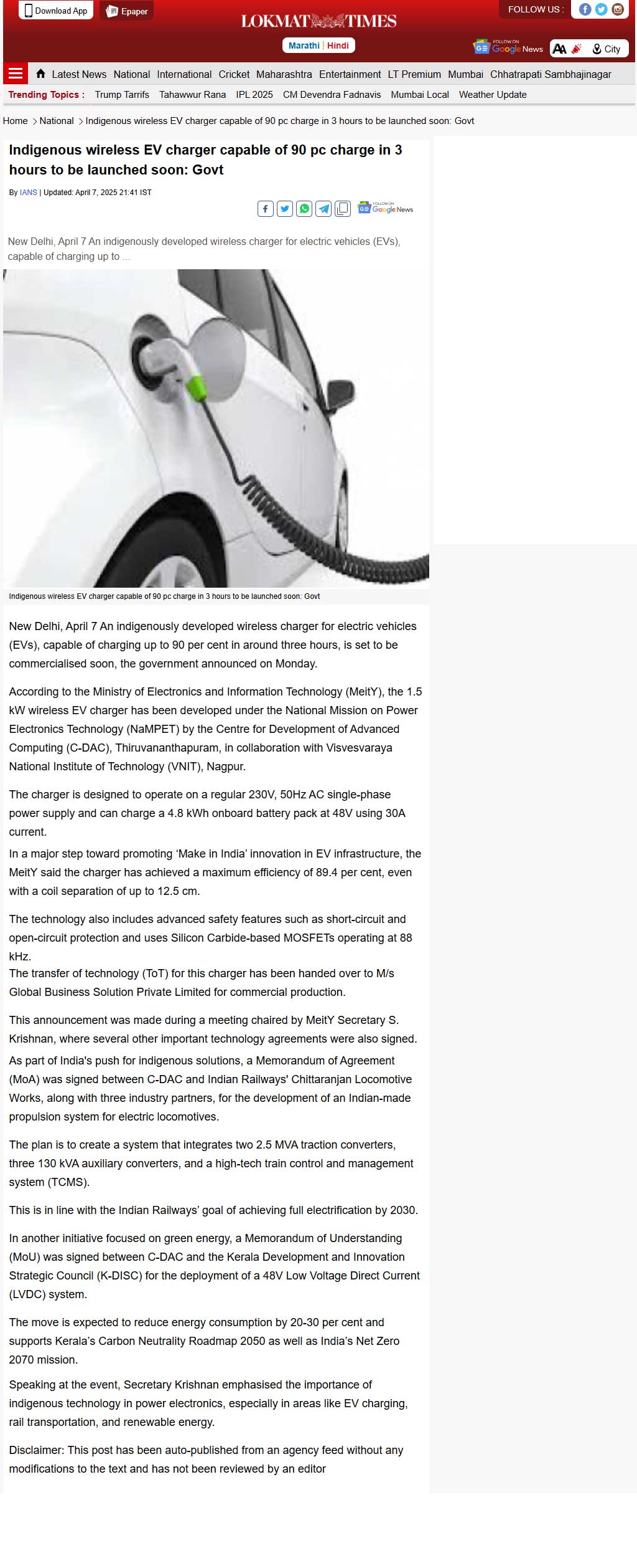 Indigenous Wireless EV charger capable of 90 pc charge in 3 hours to be launched soon: Gov