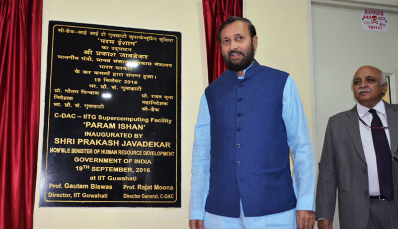 Setting the deck for driving R&D in the North East region of the nation, Shri Prakash Javadekar, Hon'ble Minister for Human Resource Development, Government of India launched the C-DAC - IIT Guwahati Supercomputing Facility 'PARAM ISHAN' at the IIT Guwahati campus, today. Also present on the occasion were Prof.Gautam Biswas, Director, IIT Guwahati, Prof Rajat Moona, Director General, C-DAC, Dr HemantDarbari, Executive Director, C-DAC, Pune, Prof S V Rao, Head, Computer Centre, IIT Guwahati, Shri Sanjay Wandhekar, Associate Director andHoD-HPC, C-DAC, senior officials from C-DAC and IIT Guwahati.