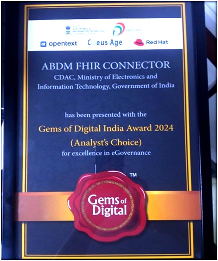 C-DAC's ABDM-FHIR Connector was recognized for its exemplary use of digital technology in e-governance by winning the Gems of Digital India Analyst Award. The award, presented by Coeus Age, highlights innovative solutions in government and business.