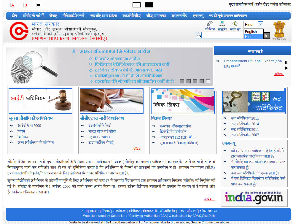 The office of Controller of Certifying Authorities (CCA) aims at promoting the growth of E-Commerce and E- Governance through the wide use of digital signatures. C-DAC has included localisation javascript snippet to convert this site into Hindi.