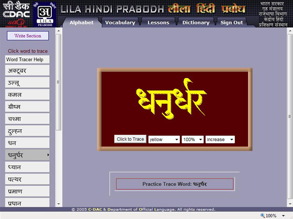 LILA-Rajbhasha LILA (Learn Indian Languages through Artificial intelligence) is multi-media based intelligent self-tutoring application for learning Hindi. LILA, in Sanskrit means 'Play'. Using LILA, learning a language on your PC can indeed be as enjoyable as playing. Hindi Prabodh, Praveen and Pragya packages offer a user-friendly and effective tool on the World Wide Web to learn Hindi through the medium of English, Assamese, Bangla, Bodo, Gujarati, Kannada, Kashmiri, Malayalam, Manipuri, Marathi, Nepalese, Oriya, Punjabi, Tamil and Telugu.