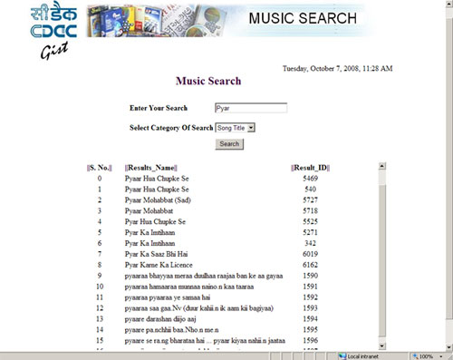 Music Search is a web based application, which simulates a Search Engine, in the Music Domain.The searching is classified into four categories, viz, Actors, Movie Title, Singer, Song Title.