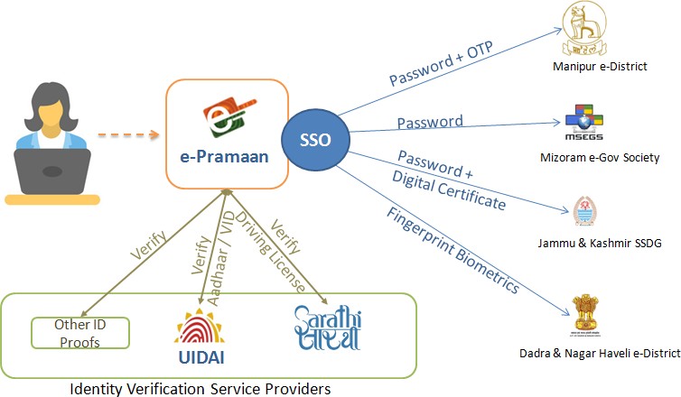 e-Pramaan is an e-Authentication framework, which facilitates multi-factor strong authentication to the users accessing various services using mobile and/or fixed platforms. It is a unique mechanism providing unified log-in facility through SAML 2.0 based Single Sign-On (SSO) for integrated services. The Single Sign-On feature provides registered users a single window access to all services that are integrated with e-Pramaan.