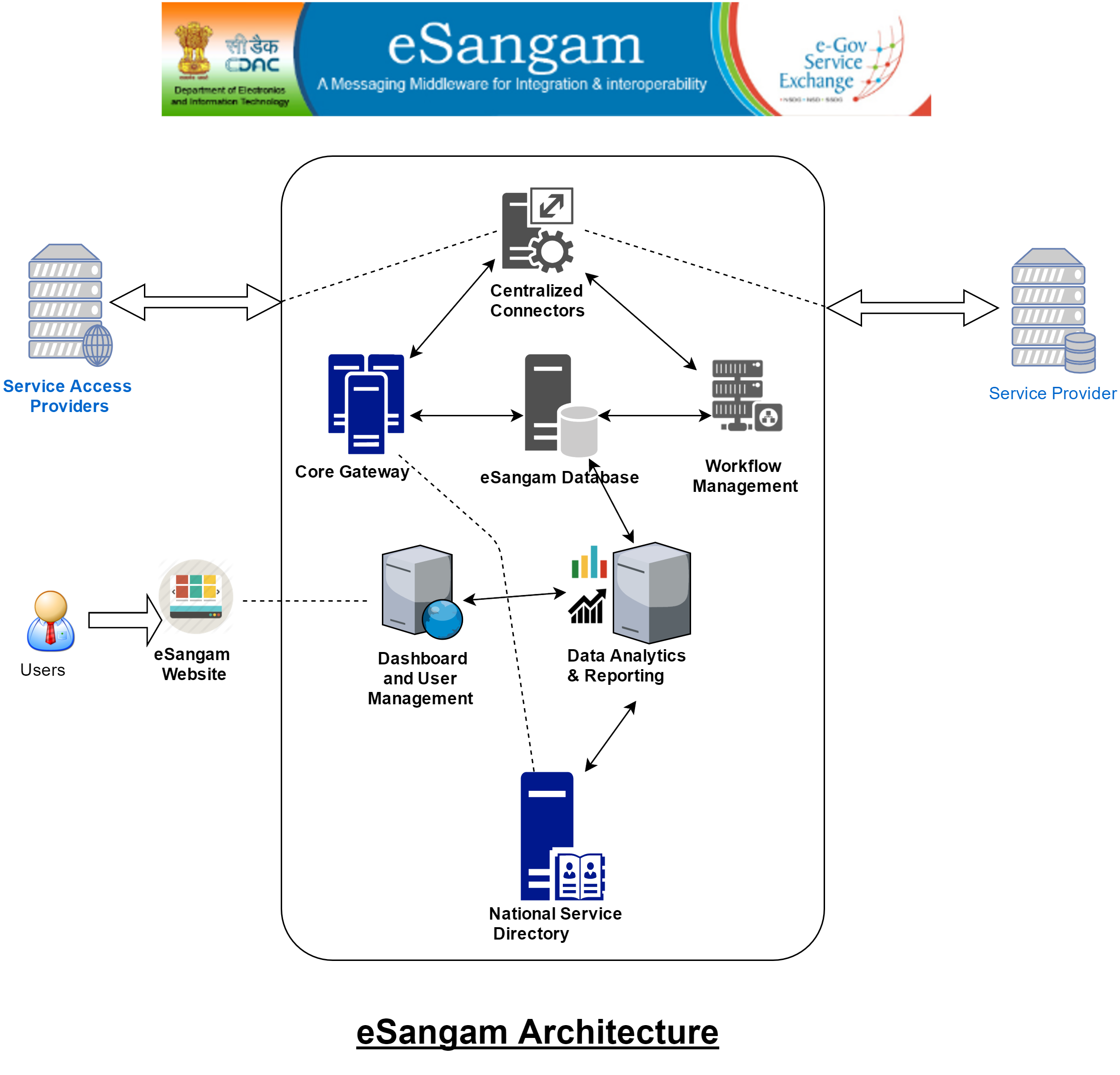 (e-governance Domain) eSangam enables seamless integration of department applications and provides a framework for single point delivery of eGovernance services of services delivered by hetrogeneous departments.