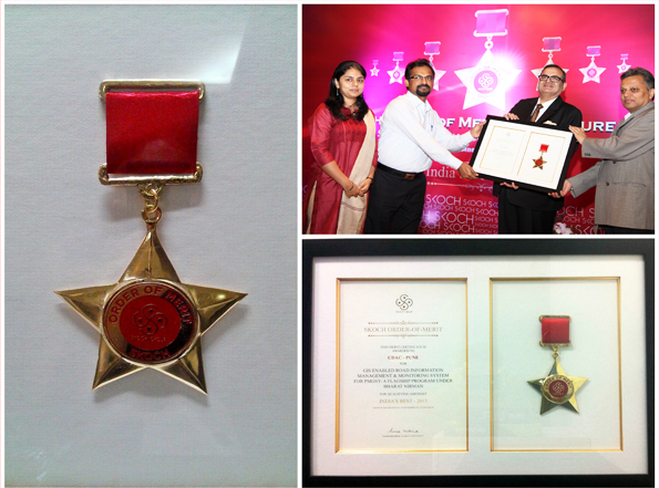 Received SKOCH ORDER-OF-MERIT 2013 for GIS enabled Road Information Management & Monitoring System (GRIMMS) under 'Pradhan Mantri Gram Sadak Yojana (PMGSY)'- a flagship program under Bharat Nirman at New Delhi in September 2013.